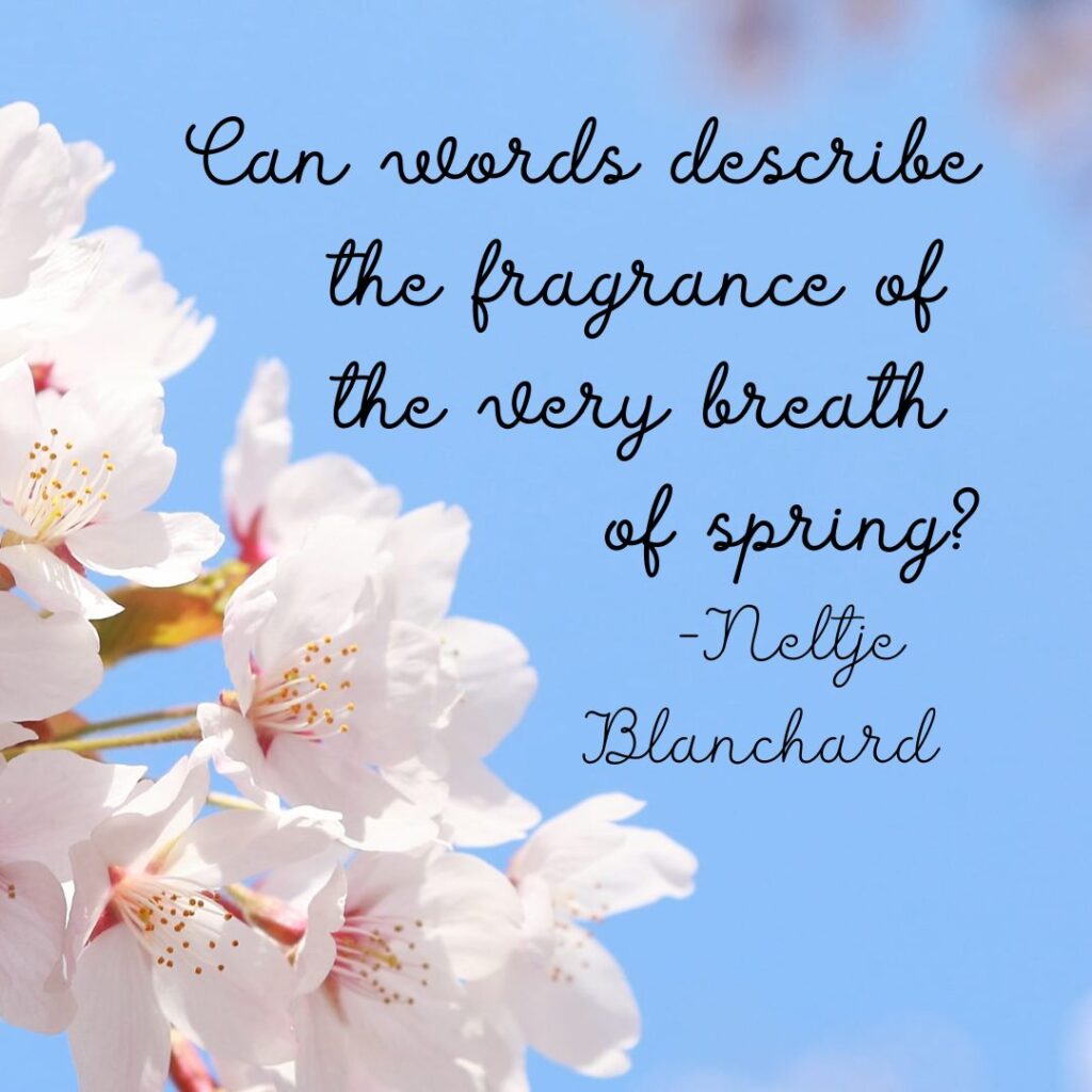 The beauty of a spring morning is hard to put into words. Try as I might to capture the sights and sounds and smells of spring, words are not adequate to describe the joy felt during a walk on a spring-time morning. Yet I strive to explain my experiences in an effort to preserve the beauty so that I might visit it again and again. I find that it is during this hopeful time of year that we are inspired to make changes… to begin again with a fresh start. As the spring rains begin to fall and new life is coaxed out of its winter slumber, we too begin to awaken to new possibilities in our lives. Spring is a time like no other and so I try to put into words the very breath of spring…